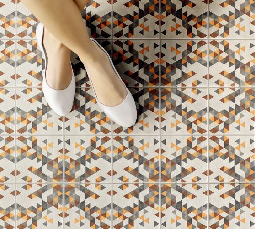 Matte OBIDOS FLOWER decorative pattern glazed porcelain boutique design floor + wall tile. This traditional geometric pattern design floor + wall tile, with assortment of colours and hand made look composition enables endless design possibilities that creates stunning open space in entrance foyers, bathroom floor + walls, kitchen splash backs, laundry floor + walls, porch + verandahs, cafes + restaurant in Architectural schemes and Interior Design concepts.