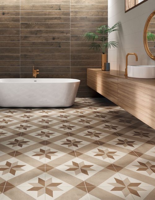 Matte JUANITA BLUE decorative pattern glazed porcelain boutique design floor + wall tile. This traditional geometric pattern design floor + wall tile, with assortment of colours and hand made look composition enables endless design possibilities that creates stunning open space in entrance foyers, bathroom floor + walls, kitchen splash backs, laundry floor + walls, porch + verandahs, cafes + restaurant in Architectural schemes and Interior Design concepts.